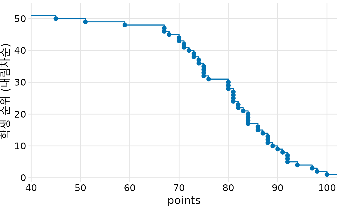 반대로 학생들의 점수를 높은 순(내림차순)으로 나열하면 어떨까요? 이 경우 그래프의 모양은 이전과 대칭을 이루게 됩니다. 이 역시 ECDF의 한 형태이며, 선은 특정 점수 이상을 받은 학생들의 최소 순위를 나타내게 됩니다(그림 Figure 10.2).