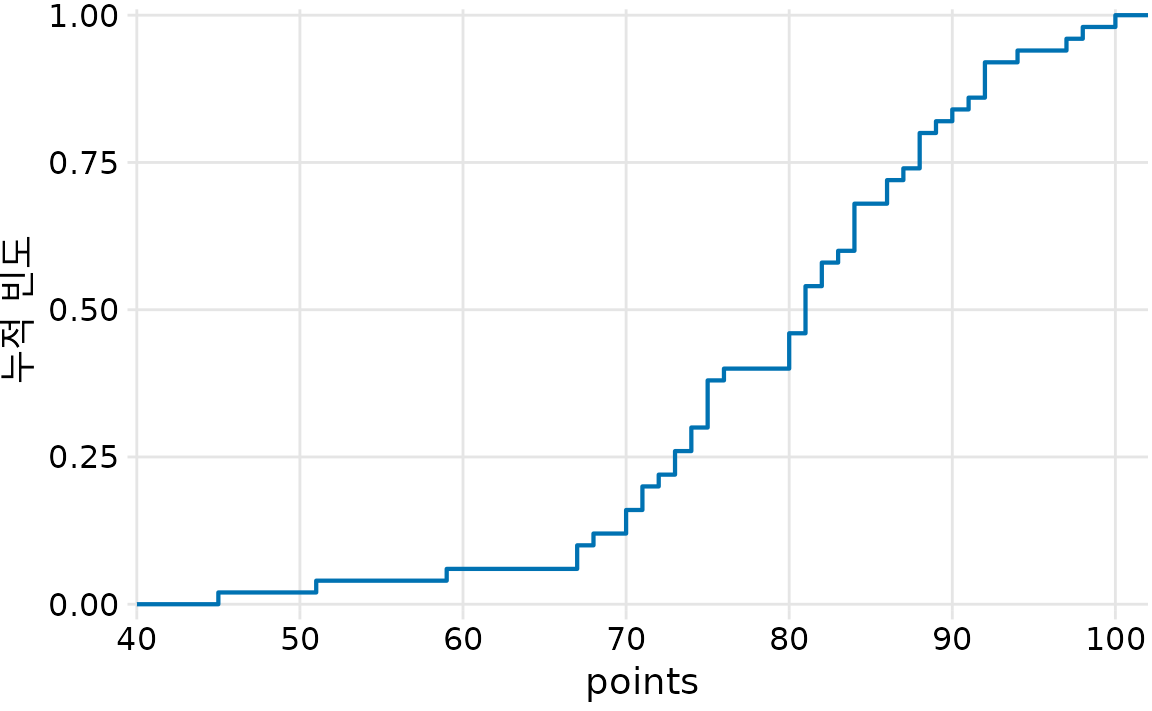 (ref:student-grades) 50명의 가상 수업 학생 성적의 경험적 누적 분포 함수.