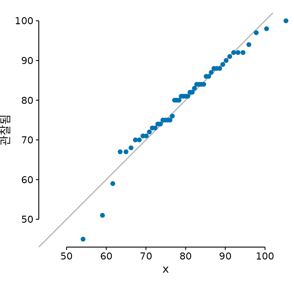 여기서 대각선 실선은 회귀선이 아니라 ’관찰값 = 이론값’인 x=y 선입니다. 점들이 이 선 위에 가지런히 놓여 있다면 데이터가 해당 분포(여기서는 정규 분포)를 잘 따르고 있다는 강력한 증거가 됩니다. 그림 ?fig-student-grades-qq를 보면 학생 성적은 정규 분포를 대체로 잘 따르지만, 양쪽 끝부분에서 약간의 이탈이 보입니다. 특히 상위권에서 점수가 선 아래로 처지는 이유는 시험 만점이 100점으로 정해져 있기 때문입니다. 아무리 뛰어난 학생이라도 100점이라는 한계선에 부딪히게 되는 것이죠.