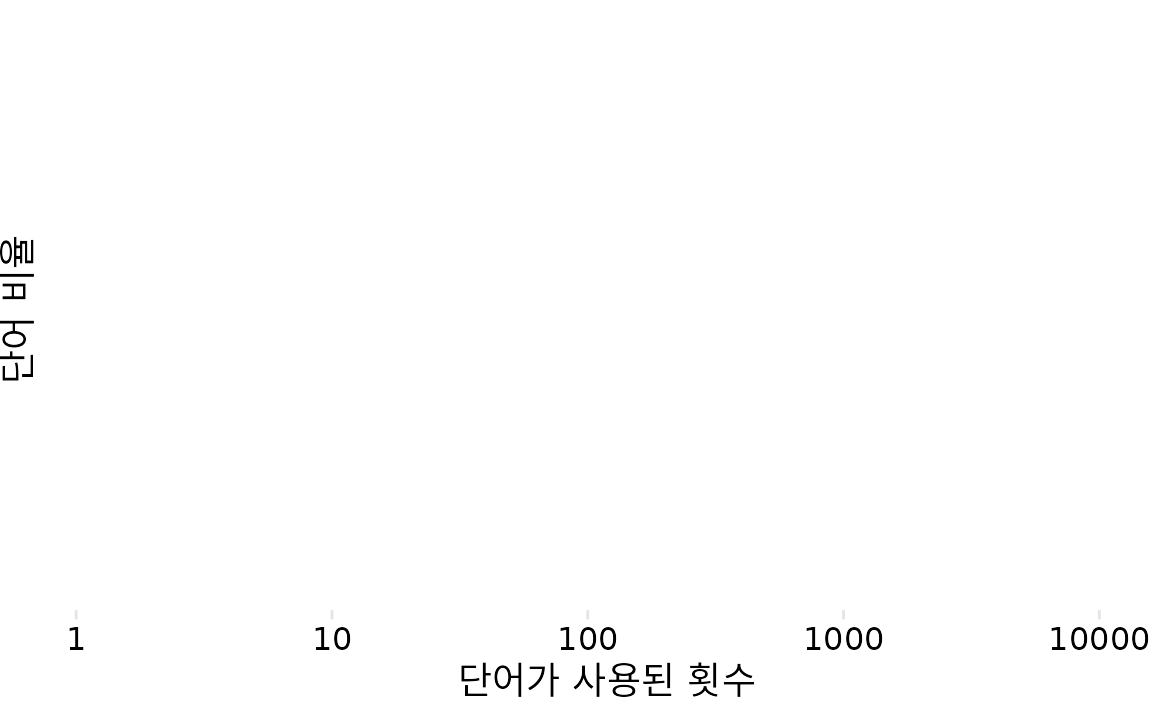 (ref:word-counts-tail-log-log) 소설 모비 딕의 단어 수 분포. 소설에서 해당 횟수 이상으로 나오는 단어의 상대 빈도 대 단어가 사용된 횟수가 표시됩니다.