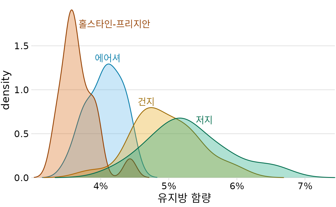 다만 이 방식은 비교 대상이 셋 이상이 되면 사용할 수 없습니다. 분포가 많을 때는 히스토그램보다는 밀도 그림이 훨씬 효과적입니다. 예를 들어 네 종류의 소 품종별 우유 유지방 비율을 비교할 때는 밀도 그림이 가장 적합한 선택입니다(그림 Figure 9.11).