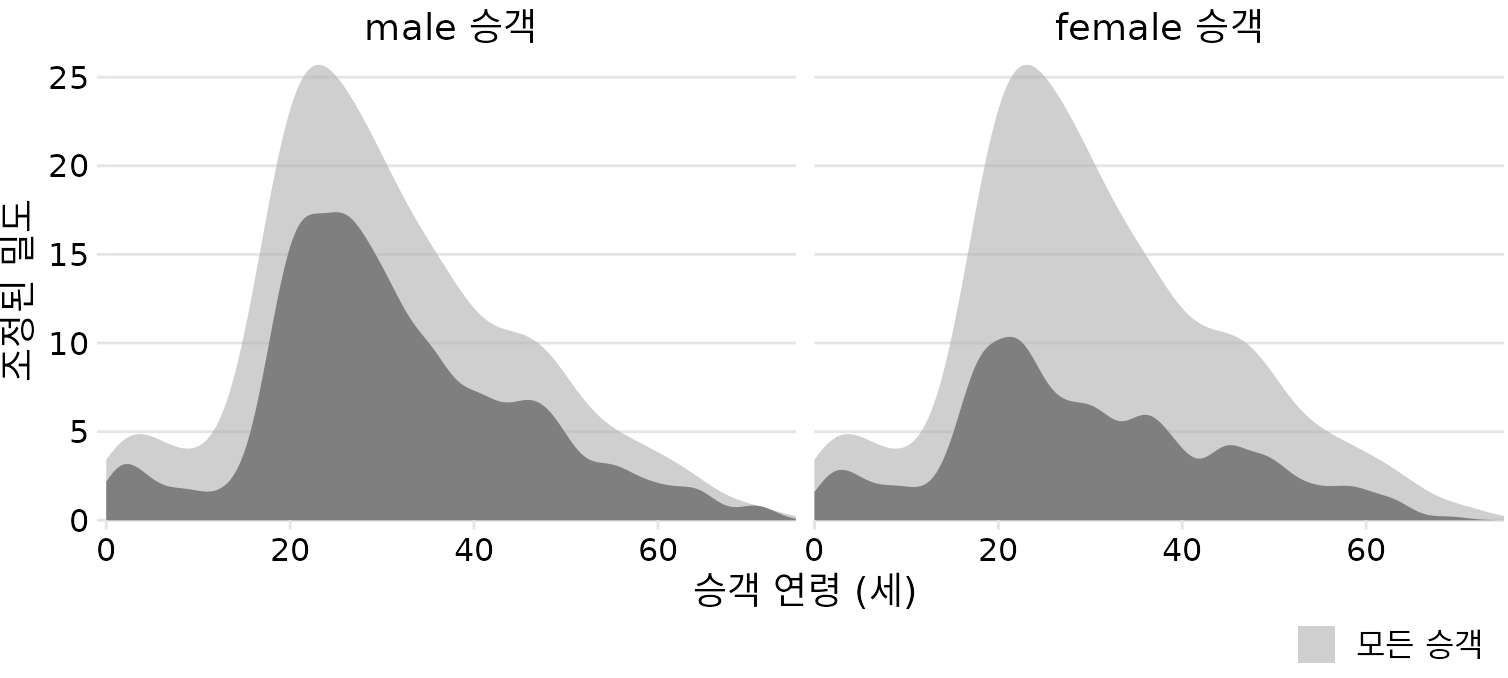 (ref:titanic-age-fractional-dens) 남성 및 여성 타이타닉호 승객의 연령 분포, 승객 총계의 비율로 표시. 색칠된 영역은 각각 남성 및 여성 승객 연령의 밀도 추정치를 나타내고 회색 영역은 전체 승객 연령 분포를 나타냅니다.