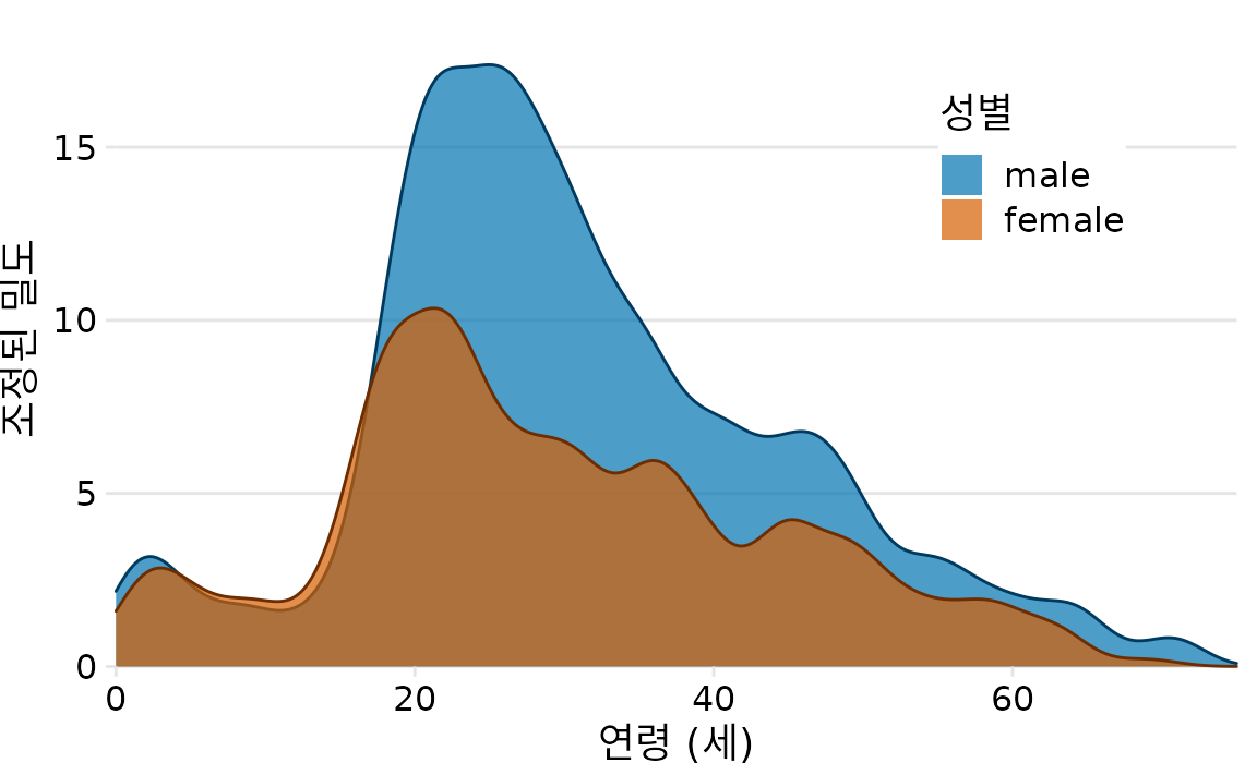 (ref:titanic-age-overlapping-dens) 남성 및 여성 타이타닉호 승객 연령의 밀도 추정치. 남성 승객이 여성 승객보다 많았음을 강조하기 위해 각 곡선 아래 면적이 알려진 연령의 남성 및 여성 승객 총 수(각각 468명 및 288명)에 해당하도록 밀도 곡선의 크기를 조정했습니다.
