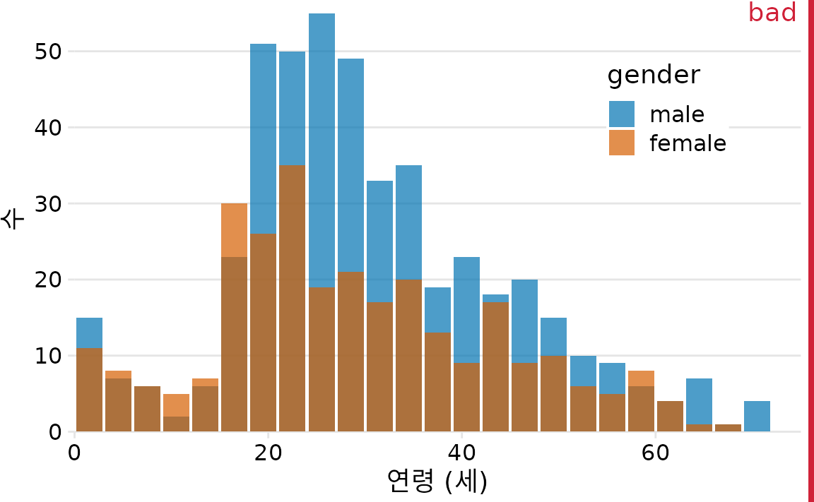 (ref:titanic-age-overlapping-hist) 남성 및 여성 타이타닉호 승객의 연령 분포, 두 개의 중첩된 히스토그램으로 표시. 이 그림은 모든 파란색 막대가 0에서 시작한다는 명확한 시각적 표시가 없기 때문에 “나쁨”으로 표시되었습니다.