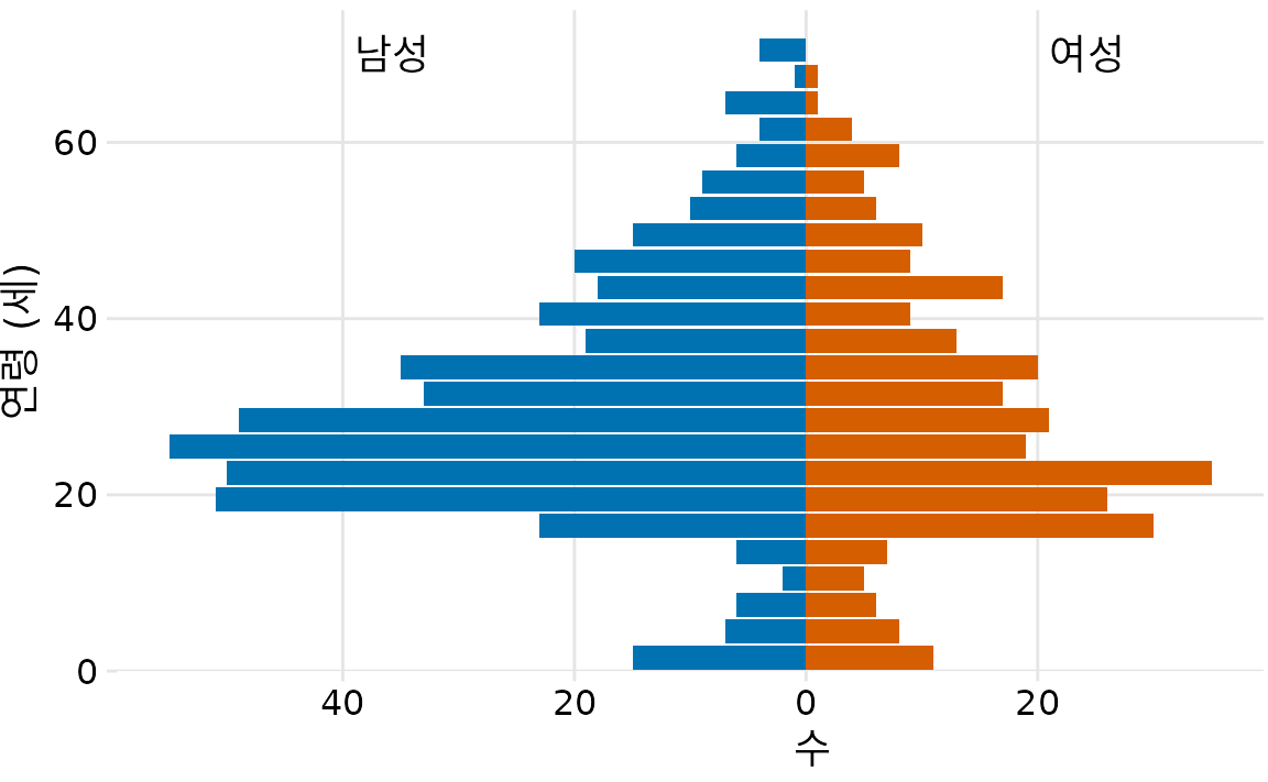 마지막으로 딱 두 개의 분포만 비교할 때는 히스토그램을 90도 회전시켜 서로 반대 방향을 보게 만드는 연령 피라미드(age pyramid) 형식이 매우 유용합니다(그림 Figure 9.10).
