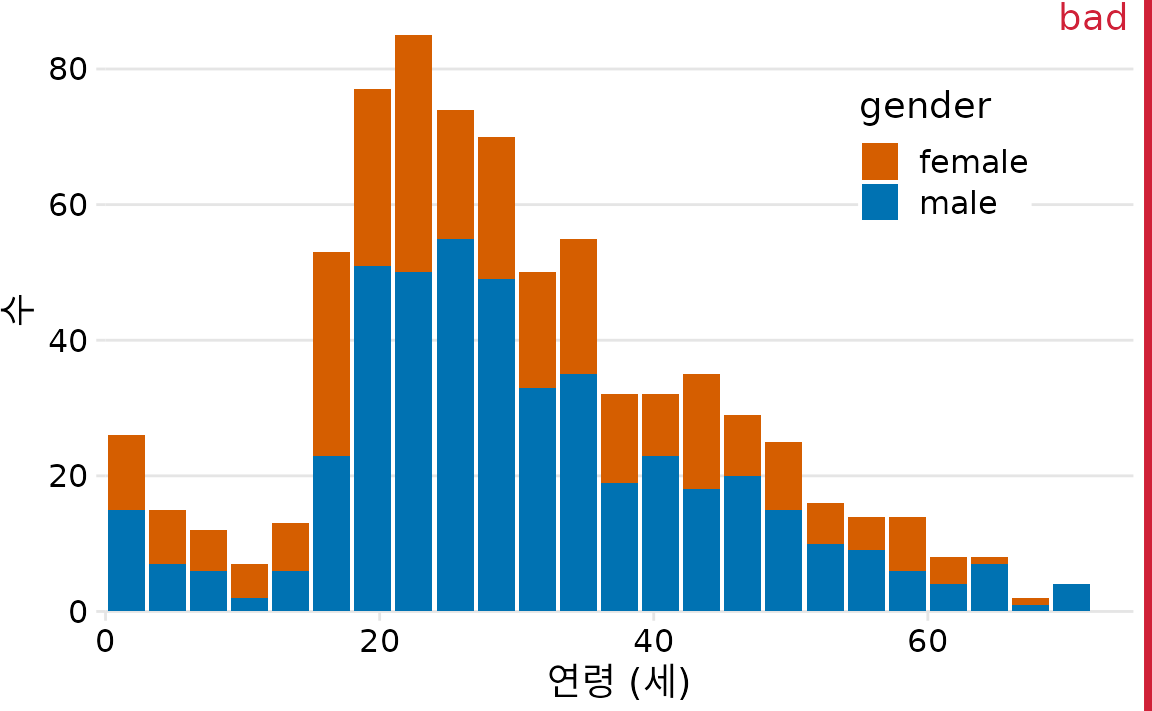저는 이런 방식의 시각화를 권장하지 않습니다. 두 가지 치명적인 문제가 있기 때문입니다. 첫째, 막대가 정확히 어디서 시작하는지 알기 어렵습니다. 18~20세 여성 인원수가 색깔이 변하는 지점부터인지, 아니면 0부터인지 헷갈리게 됩니다(정답은 전자입니다). 둘째, 여성 승객의 인원수를 서로 비교하기가 불가능에 가깝습니다. 막대들의 시작 높이가 제각각이기 때문입니다. 예를 들어 남성이 여성보다 평균 연령이 높다는 사실이 이 그래프에서는 전혀 드러나지 않습니다.