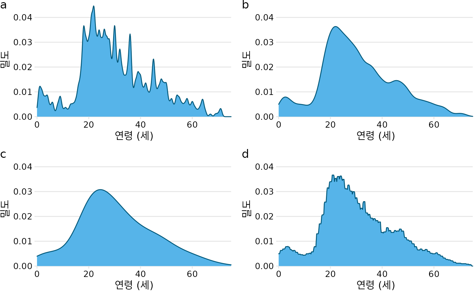 히스토그램의 구간 너비처럼, 밀도 그림에서도 대역폭과 커널의 선택이 결과물의 모양을 결정합니다(그림 Figure 9.4). 대역폭이 너무 좁으면 곡선이 너무 들쭉날쭉해져서 큰 흐름을 보기 어렵고, 너무 넓으면 중요한 세부 정보가 사라집니다. 커널의 종류도 영향을 주는데, 가우시안 커널은 매끄러운 곡선을 만드는 반면 직사각형(rectangular) 커널은 계단 모양의 각진 선을 만듭니다(그림 Figure 9.4 (d)). 데이터가 많을수록 커널의 종류는 크게 중요하지 않게 됩니다. 밀도 그림은 데이터가 많을 때는 매우 신뢰할 만한 도구이지만, 데이터 포인트가 몇 개 없을 때는 오히려 데이터의 실제 모습을 왜곡할 위험이 있습니다.