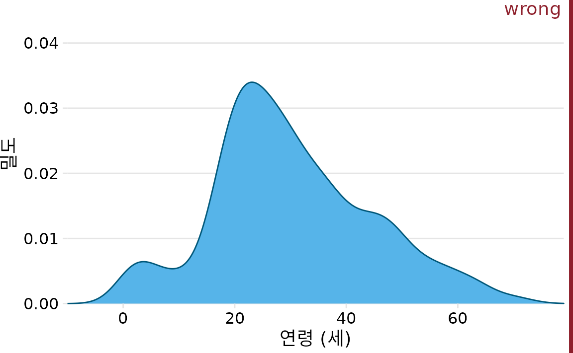 커널 밀도 추정을 사용할 때 주의할 점이 하나 있습니다. 데이터가 전혀 없는 영역임에도 불구하고, 분포의 꼬리 부분이 늘어나면서 마치 데이터가 존재하는 것처럼 보일 수 있다는 것입니다. 자칫하면 현실적으로 불가능한 결과물을 낼 수 있는데, 예를 들어 아무 조치를 취하지 않으면 ‘음수(-)’ 연령대의 승객이 있는 것처럼 그려질 수 있습니다(그림 Figure 9.5).