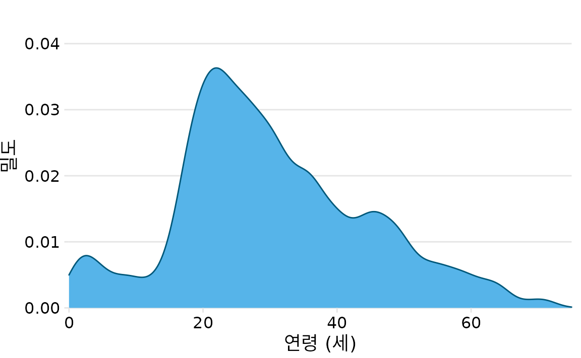 밀도 곡선은 대개 곡선 아래의 전체 면적이 1이 되도록 그려집니다. 이 때문에 y축의 수치가 다소 생소하게 느껴질 수 있습니다. 예를 들어 연령이 0세에서 75세까지라면 평균 높이는 약 0.013(1/75) 정도가 됩니다. 그림 ?fig-titanic-ages-dens-grid를 보면 y축 값이 0에서 0.04 사이에 분포하며 평균적으로 0.01 근처임을 확인할 수 있습니다.