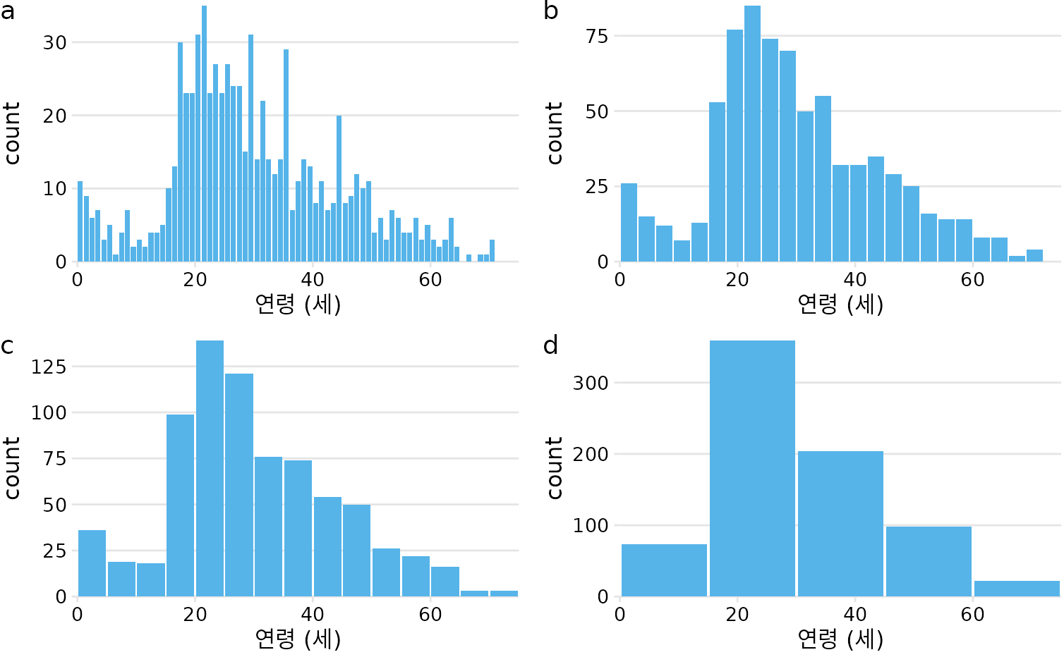 타이타닉 승객의 연령 분포를 예로 들면, 구간 너비가 1년이면 너무 세밀하고 15년이면 너무 뭉뚱그려집니다. 3~5년 정도가 데이터의 특성을 보여주기에 적당함을 알 수 있습니다(그림 Figure 9.2).