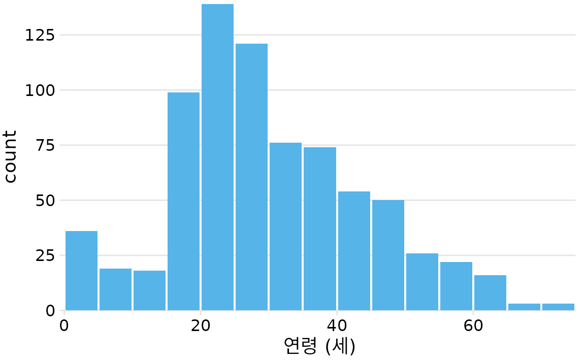 데이터 세트에서 특정 변수가 어떻게 분포되어 있는지 파악해야 하는 상황은 매우 흔합니다. 구체적인 예를 들기 위해 양 시각화하기 장에서 보았던 타이타닉호 승객 데이터를 다시 살펴보겠습니다. 타이타닉호에는 약 1,300명의 승객이 탑승했는데(승무원 제외), 그중 756명의 연령 정보가 알려져 있습니다. 우리는 어린이, 청년, 중년, 노인 등 각 연령대별로 승객이 얼마나 많았는지 알고 싶을 것입니다. 이렇듯 집단 내에서 여러 값의 상대적인 비중을 나타내는 것을 연령 분포(age distribution)라고 합니다.