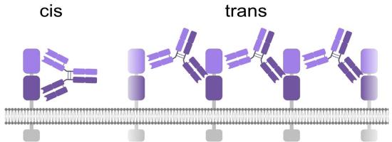 Binding to two distinct, non-overlapping epitopes on the same target results in unique properties of bpAbs compared to other antibodies. Many bpAbs show superior binding and slower dissociation from the target compared to their monoparatopic parent antibodies. This is a result of avid binding to two distinct epitopes either on the same (cis) or different (trans) target molecules (Figure 2 (a)). Avidity is defined as the combination of multiple noncovalent interactions by a single molecule and the associated increase in likelihood of binding and rebinding events once the first interaction is established (n.d.r). Antibody fragments targeting distinct epitopes can be linked to increase target affinity via avidity as highlighted by the