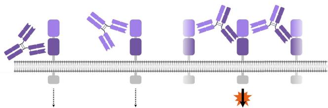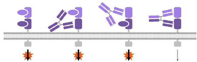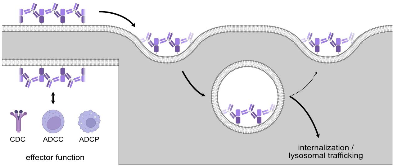 Receptor clustering by bpAbs increases the local concentration of Fc domains and can thereby lead to improved effector function (Figure 2 (e)). This effect has been observed with multivalent complexes targeted by mAbs, for example the B-cell marker CD20 targeted by the therapeutic mAb rituximab (n.d.am). Biparatopic binding by the antibody can extend this MoA to more targets. The formation of a large HER2 cluster by zanidatamab, for example, was shown to result in more potent complement-dependent cytotoxicity (CDC) compared to a combination of the parent mAbs due to Fc domain preorganization and the resulting increase in C (n.d.a)q deposition (n.d.p). This effect was further amplified for the anti-CD37 bpAb GEN3009 by introduction of a hexamerization enhancing point mutation in the Fc domain (n.d.n). Although less pronounced, Fc clustering by bpAbs has been shown to additionally improve antibodydependent cell-mediated cytotoxicity (ADCC) by increasing binding to FcγRIII receptors on natural killer (NK) cells (n.d.an). Analogously, cluster formation by an anti-interleukin (n.d.f) (IL6)