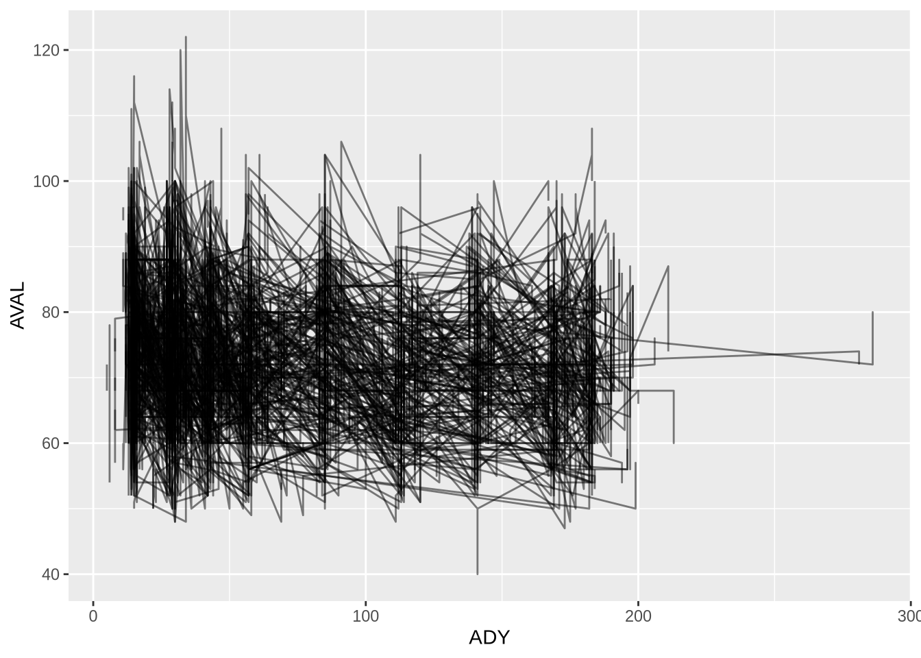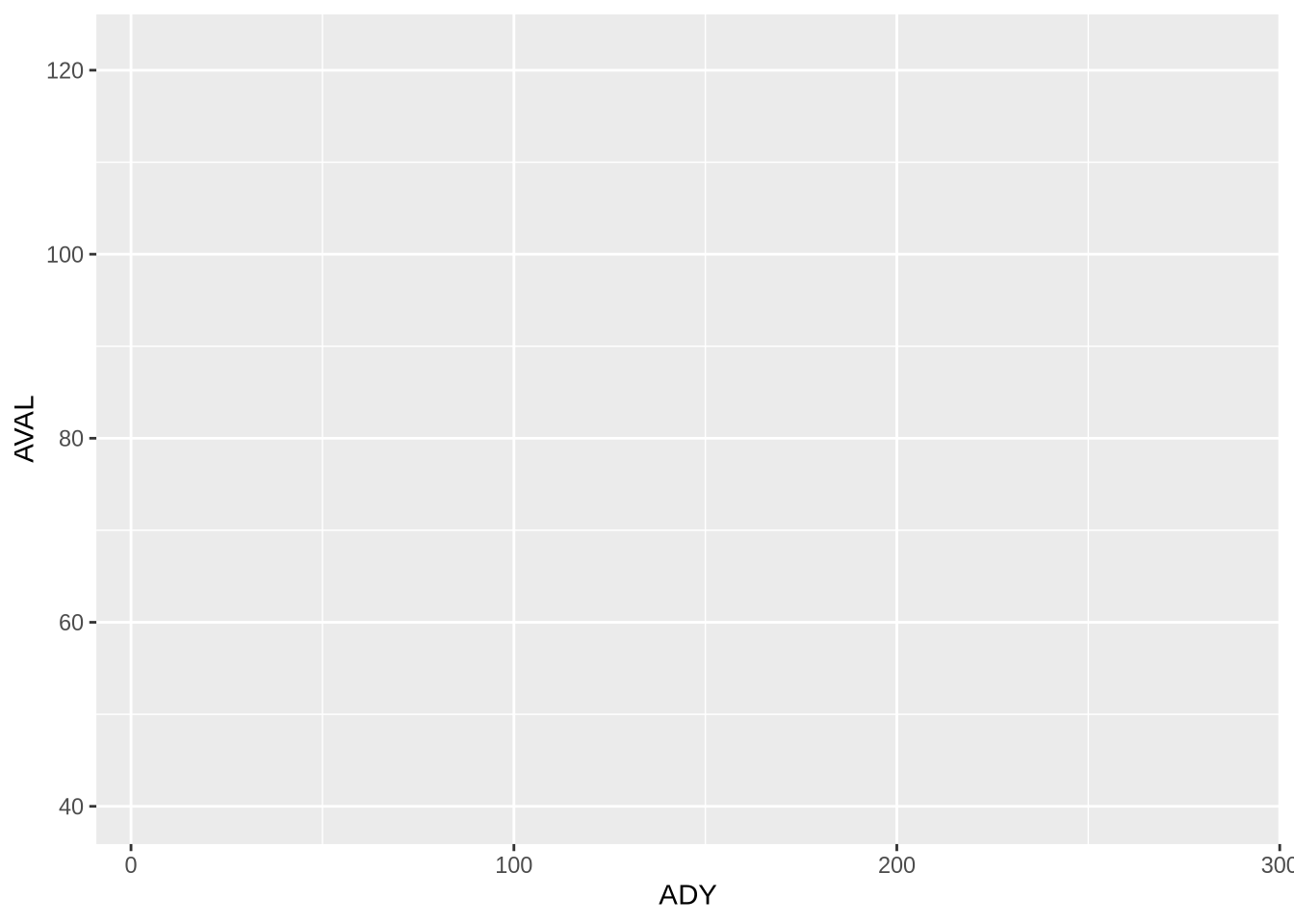 ggplot(mapping = aes(x = ADY, y = AVAL, group = USUBJID)) +