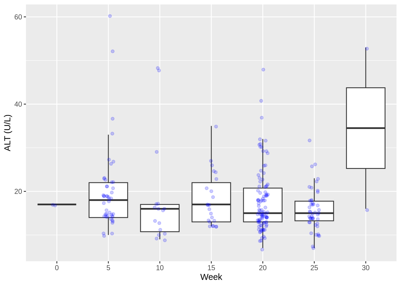 labs(x = "Week", y = "ALT (U/L)")