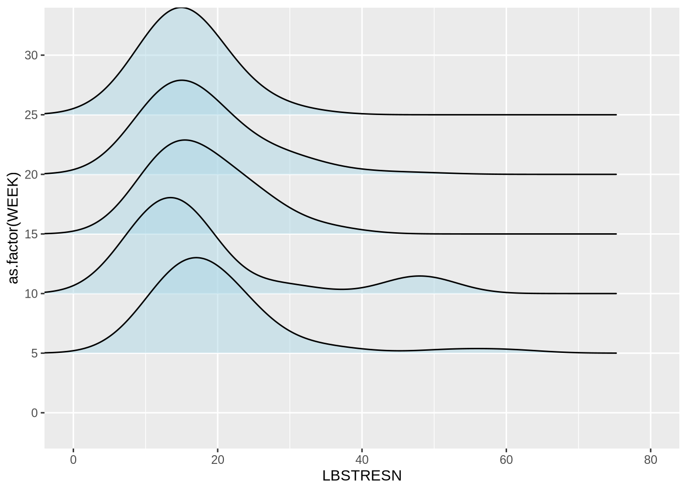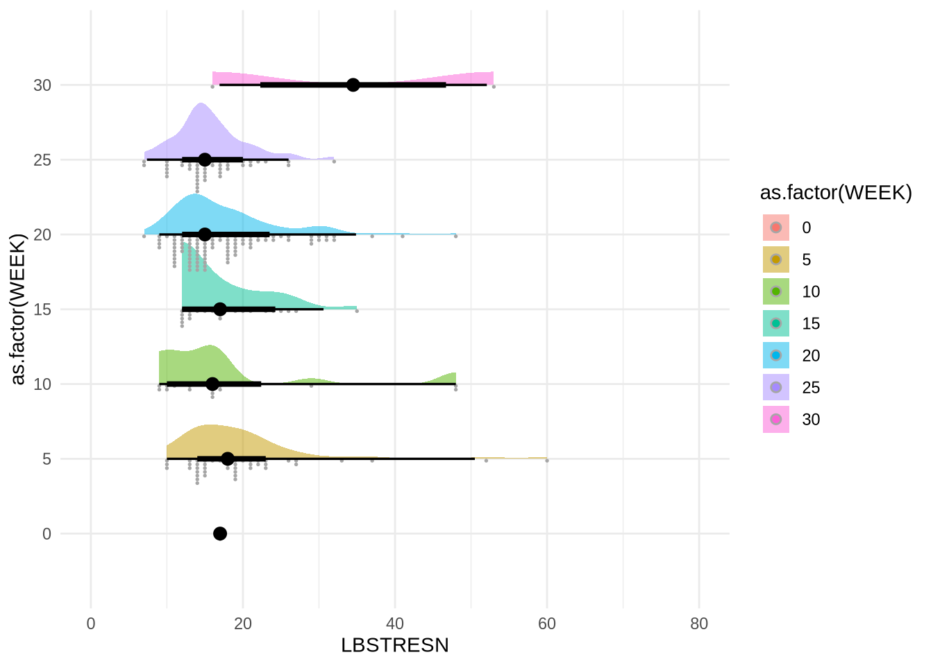ggplot(mapping = aes(x = LBSTRESN, y = as.factor(WEEK), fill = as.factor(WEEK))) +
