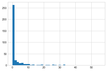 plt.style.use("seaborn-whitegrid")plt.hist(rainfall_mm, 40);