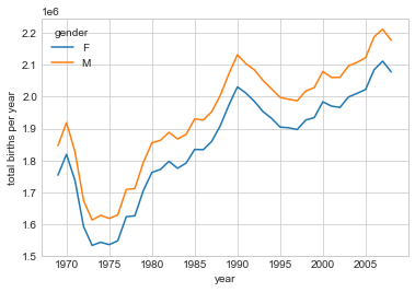 plt.ylabel("total births per year");