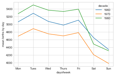 plt.ylabel("mean births by day");