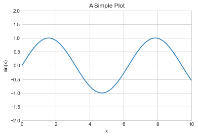 ax.set(xlim=(0, 10), ylim=(-2, 2), xlabel="x", ylabel="sin(x)", title="A Simple Plot");