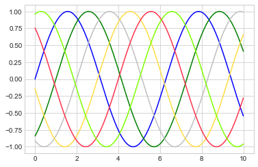 플롯에 적용할 첫 번째 조정은 선 색상과 스타일을 제어하는 것입니다. ‘plt.plot’ 함수는 이를 지정하는 데 사용할 수 있는 추가 인수를 사용합니다. 색상을 조정하려면 상상할 수 있는 거의 모든 색상을 나타내는 문자열 인수를 허용하는 ‘color’ 키워드를 사용합니다. 색상은 다양한 방법으로 지정합니다. 다음 예제의 출력은 다음 그림을 참조하세요.