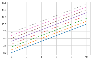 플롯의 모양을 미세 조정하는 데 사용할 수 있는 다른 키워드 인수가 많이 있습니다. 자세한 내용은 IPython의 도움말 도구를 사용하여 plt.plot 함수의 독스트링을 읽어보세요(IPython의 도움말과 문서 참조).