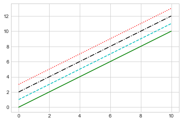 코드를 읽는 사람에게는 덜 명확할 수 있지만 linestyle 및 color 코드를 plt.plot 함수에 대한 키워드가 아닌 단일 인수로 결합하여 일부 키 입력을 절약합니다. 다음 그림은 결과를 보여줍니다.