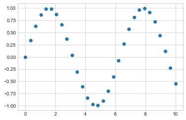x = np.linspace(0, 10, 30)