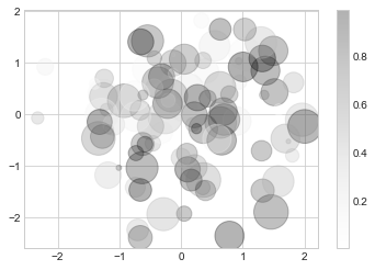 색상 인수는 색상 척도(여기서는 colorbar 명령으로 표시됨)에 자동으로 매핑되고 크기 인수는 픽셀 단위로 제공됩니다. 이러한 방식으로 다차원 데이터를 시각화하기 위해 포인트의 색상과 크기를 사용하여 시각화의 정보를 전달합니다.