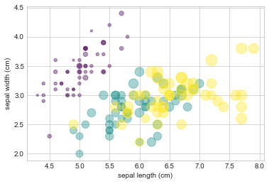 이 산점도를 통해 데이터의 네 가지 다른 차원을 동시에 탐색할 수 있는 기능이 제공되었음을 확인합니다. 각 점의 (x, y) 위치는 꽃받침 길이와 너비에 해당하고 점의 크기는 꽃잎 너비와 관련이 있으며 색상은 특정 꽃 종과 관련이 있습니다. 이와 같은 다중 색상 및 다중 기능 산점도는 데이터 탐색 및 표시 모두에 유용합니다.