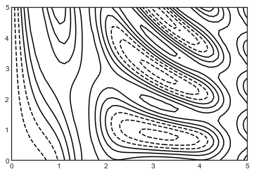 return np.sin(x) ** 10 + np.cos(10 + y * x) * np.cos(x)등고선 플롯은 ‘plt.contour’ 함수를 사용하여 생성합니다. x 값 그리드, y 값 그리드, z 값 그리드의 세 가지 인수를 사용합니다. The x and y values represent positions on the plot, and the z values will be represented by the contour levels. 아마도 이러한 데이터를 준비하는 가장 간단한 방법은 1차원 배열에서 2차원 그리드를 만드는 np.meshgrid 함수를 사용하는 것입니다.