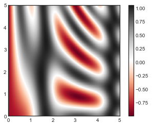 여기서는 ‘RdGy’(Red-Gray의 약어) 컬러맵을 선택했습니다. 이는 발산형 데이터(즉, 0을 중심으로 양수 및 음수 변동이 있는 데이터)에 적합한 선택입니다. Matplotlib에는 다양한 색상 맵이 있으며 plt.cm 모듈에서 탭 완성을 수행하여 IPython에서 쉽게 탐색합니다.