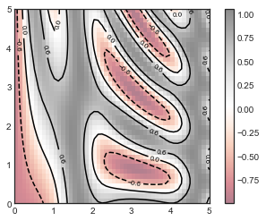 마지막으로 등고선 플롯과 이미지 플롯을 결합하는 것이 유용한 경우가 있습니다. 예를 들어 여기서는 부분적으로 투명한 배경 이미지(alpha 매개변수를 통해 투명도가 설정된)를 사용하고 plt.clabel 함수를 사용하여 윤곽선 자체에 레이블이 있는 윤곽선을 오버플로팅합니다(다음 그림 참조).