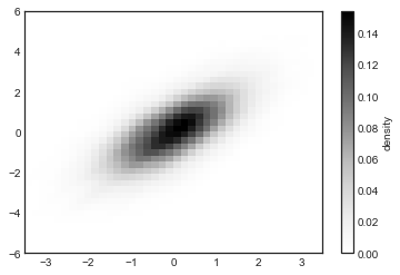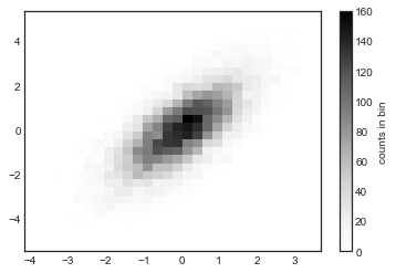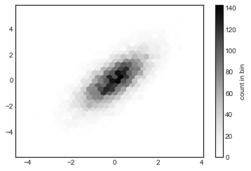 plt.hist와 마찬가지로 plt.hist2d에는 플롯과 비닝을 미세 조정할 수 있는 여러 추가 옵션이 있으며, 이는 함수 docstring에 잘 설명되어 있습니다. 또한 plt.hist에 np.histogram에 대응되는 부분이 있는 것처럼 plt.hist2d에는 np.histogram2d에 대응되는 부분이 있습니다.