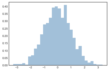 data = rng.normal(size=1000)히스토그램, 비닝 및 밀도