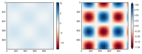 Matplotlib을 사용하면 광범위한 색상 막대 사용자 정의가 가능합니다. 컬러바 자체는 단순히 ‘plt.Axes’의 인스턴스이므로 지금까지 본 모든 축 및 눈금 형식 지정 트릭을 적용합니다. 컬러바에는 몇 가지 흥미로운 유연성이 있습니다. 예를 들어 ’extend’ 속성을 설정하여 색상 제한을 좁히고 위쪽과 아래쪽에 삼각형 화살표를 사용하여 범위를 벗어난 값을 표시합니다. 예를 들어 노이즈가 있는 이미지를 표시하는 경우 유용합니다(다음 그림 참조).