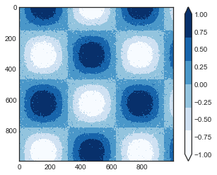 컬러맵은 연속형이지만 때로는 이산형 값을 표현하고 싶을 때도 있습니다. 이를 수행하는 가장 쉬운 방법은 plt.cm.get_cmap 함수를 사용하고 원하는 빈 수와 함께 적합한 색상맵의 이름을 전달하는 것입니다(다음 그림 참조).