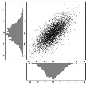 여백과 함께 플롯되는 이러한 유형의 분포는 Seaborn 패키지에 자체 플롯 API가 있을 정도로 일반적입니다. 자세한 내용은 Seaborn을 사용한 시각화를 참조하세요.