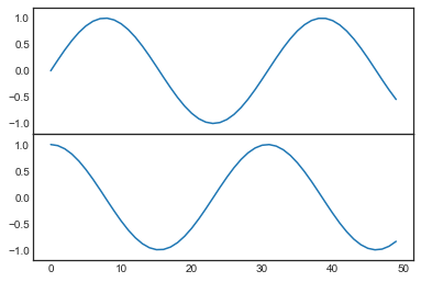 plt.subplots_adjust 명령을 사용하여 이러한 플롯 사이의 간격을 조정합니다. 다음 코드는 동등한 객체 지향 명령 fig.add_subplot을 사용합니다. 다음 그림은 결과를 보여줍니다.