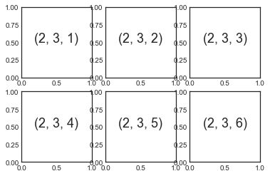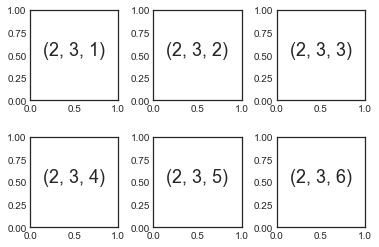 정렬된 하위 플롯의 열이나 행은 Matplotlib에 쉽게 생성할 수 있는 여러 편의 루틴이 있을 만큼 충분히 일반적인 요구 사항입니다. 이들 중 가장 낮은 수준은 그리드 내에 단일 하위 플롯을 생성하는 ’plt.subplot’입니다. 보시다시피, 이 명령은 행 수, 열 수, 왼쪽 위에서 오른쪽 아래로 실행되는 플롯의 인덱스 등 세 가지 정수 인수를 사용합니다(다음 그림 참조).