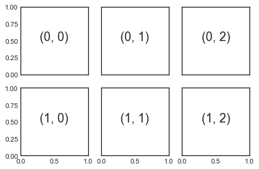 ax[i, j].text(0.5, 0.5, str((i, j)),