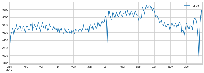for (month, day) in births_by_date.index]fig, ax = plt.subplots(figsize=(12, 4))