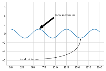 ax.annotate('local minimum', xy=(5 * np.pi, -1), xytext=(2, -6),