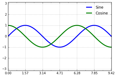 Matplotlib의 기본 눈금 형식은 아쉬운 점이 많을 수 있습니다. 광범위한 기본값으로 잘 작동하지만 때로는 다른 작업을 수행하고 싶을 수도 있습니다. 사인과 코사인 곡선의 플롯을 고려하십시오(다음 그림 참조).