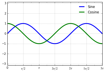 그러나 이제 이러한 눈금 레이블은 약간 어리석게 보입니다. \(\pi\)의 배수라는 것을 알 수 있지만 십진수 표현은 이를 즉시 전달하지 않습니다. 이 문제를 해결하려면 눈금 포맷터를 변경하면 됩니다. 우리가 원하는 작업에 대한 기본 제공 포맷터가 없으므로 대신 틱 출력에 대한 세밀한 제어를 제공하는 사용자 정의 함수를 허용하는 plt.FuncFormatter를 사용하겠습니다(다음 그림 참조).