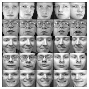 x축에서 레이블을 제거하고(눈금/눈금선은 유지) y축에서 눈금(따라서 레이블과 눈금선도 포함)을 제거했습니다. 체크 표시가 전혀 없으면 여러 상황(예: 이미지 격자를 표시하려는 경우)에서 유용합니다. 예를 들어 지도 머신러닝(Machine Learning) 문제에 자주 사용되는 예인 다양한 얼굴의 이미지가 포함된 다음 그림을 고려해 보세요(예: 심층: 지원 벡터 머신 참조).