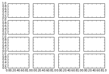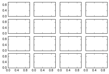 fig, ax = plt.subplots(4, 4, sharex=True, sharey=True)