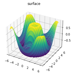표면 플롯은 와이어프레임 플롯과 비슷하지만 와이어프레임의 각 면은 채워진 다각형입니다. 채워진 다각형에 컬러맵을 추가하면 다음 그림에서 볼 수 있듯이 시각화되는 표면의 토폴로지를 인식하는 데 도움이 될 수 있습니다.