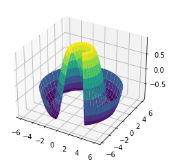 표면도의 값 격자는 2차원이어야 하지만 직선일 필요는 없습니다. 다음은 surface3D 플롯과 함께 사용하면 시각화 중인 함수에 대한 조각을 제공할 수 있는 부분 극좌표 그리드를 생성하는 예입니다(다음 그림 참조).