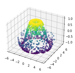 ax.scatter(x, y, z, c=z, cmap="viridis", linewidth=0.5);